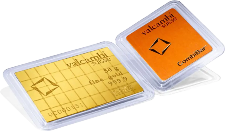 Cosa c’è di meglio di un lingotto d’oro in formato carta di credito, che sia anche facilmente divisibile per eventuali scambi? Il lingotto CombiBar® contiene 50 grammi pieni d’oro puro 999,9/1000 e assomiglia ad una tavoletta di cioccolato, è costituito da 50 piccoli lingotti da 1 grammo. Questo prodotto innovativo della zecca svizzera Valcambi è molto apprezzato dagli investitori, in particolare per il formato e il design. Un lingotto d’oro CombiBar® è anche un’idea regalo geniale per occasioni importanti: simpatico e di grande valore.